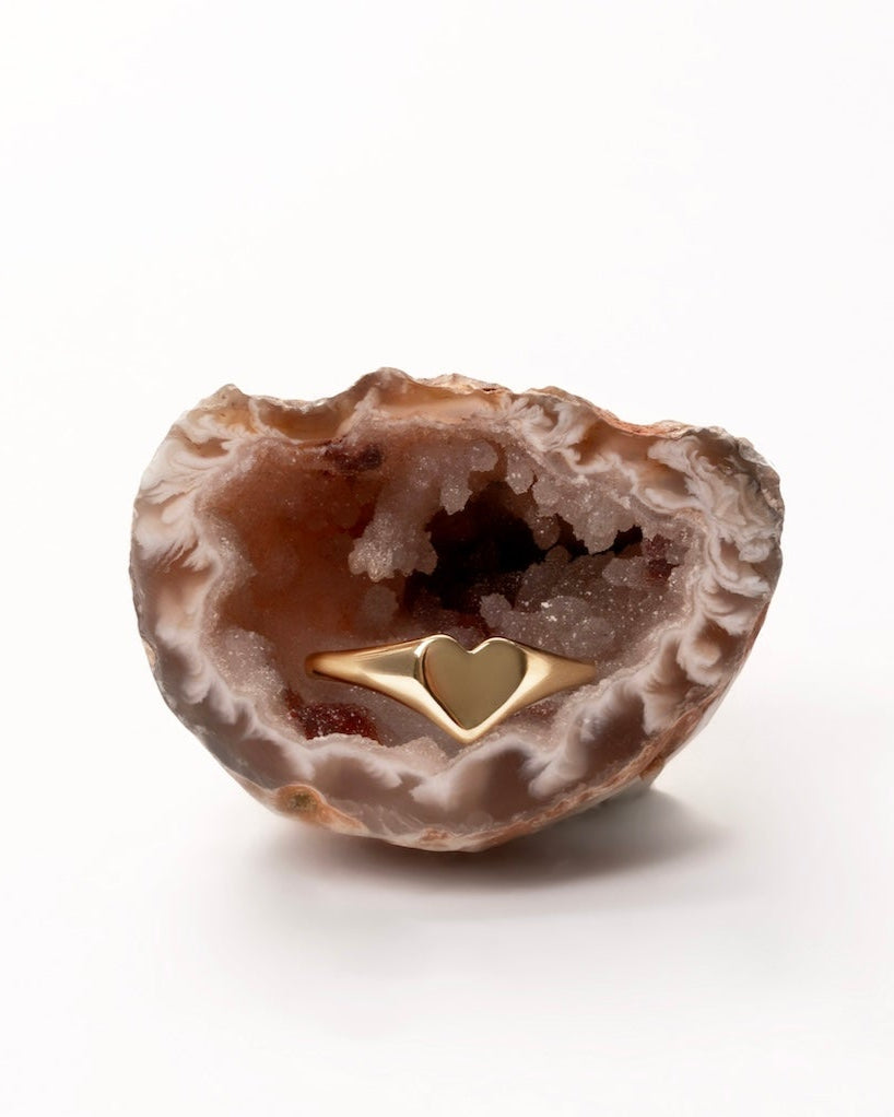- A gold ring with a softly raised heart — no stones, just intention.